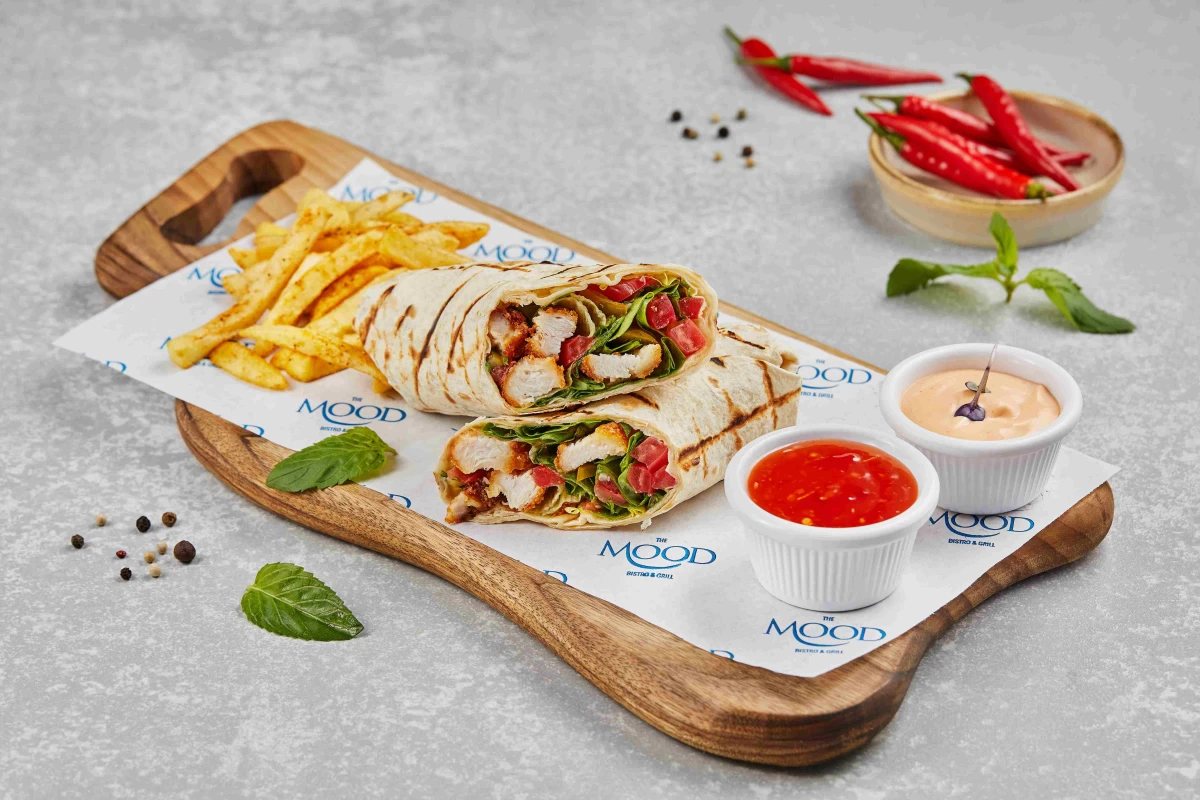 toyuq nuggets, tortilla lavaş, rukkola, pomidor, turşu xiyar, kartof fri, sweet chili sous, sriracha mayo sous