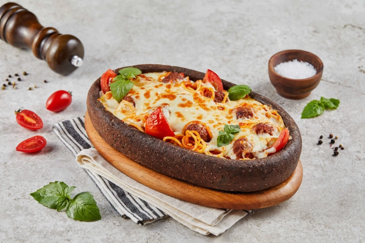 spaqetti, köfte, pomidor, mozarella pendiri, pomidor sousu, parmezan
