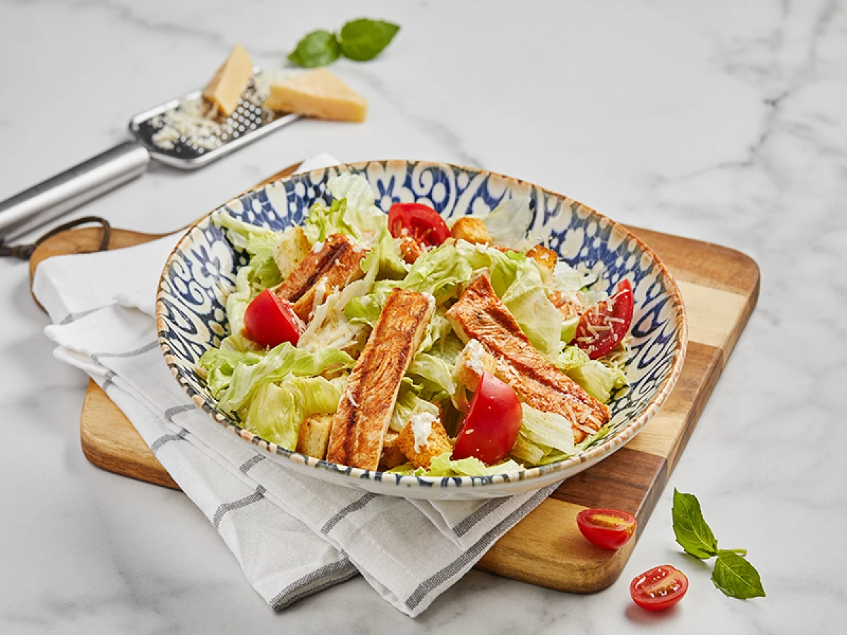 qrildə toyuq filesi, aysberq kələmi, pomidor, krutonlar, parmezan pendiri, "Sezar" sousu