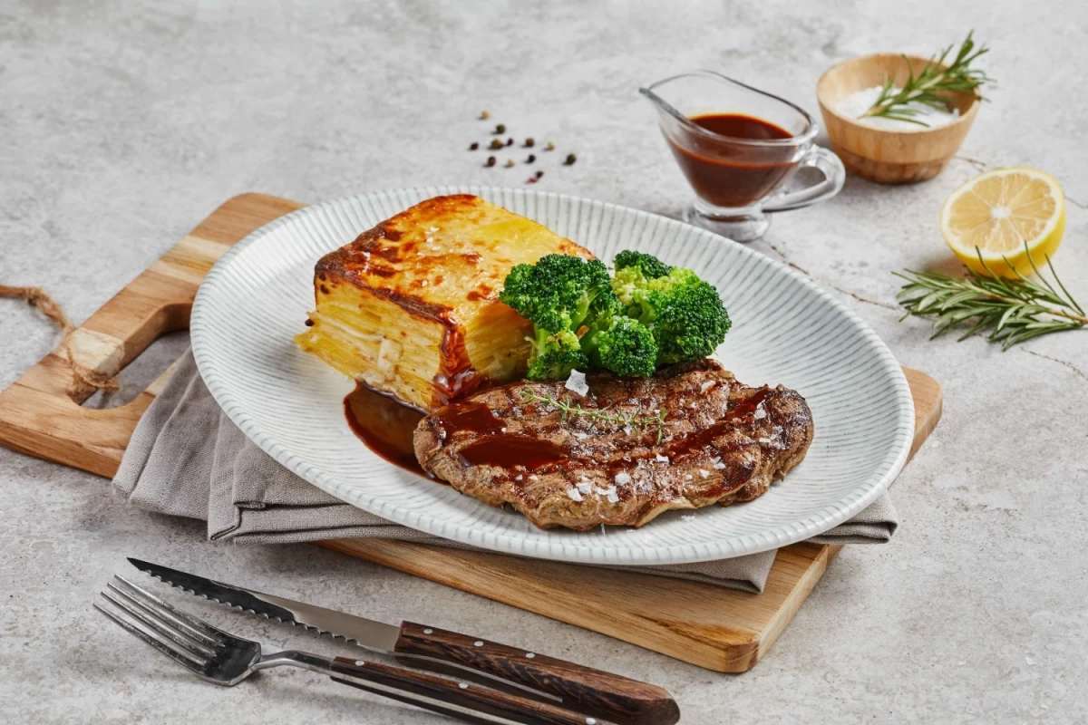 beef, potato gratin, broccoli, demi-glace sauce