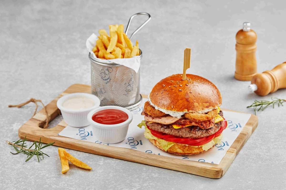 veal burger, burger bun, cheddar cheese, tartar sauce, lettuce, onions, tomatoes, ham, French fries, ketchup, mayonnaise