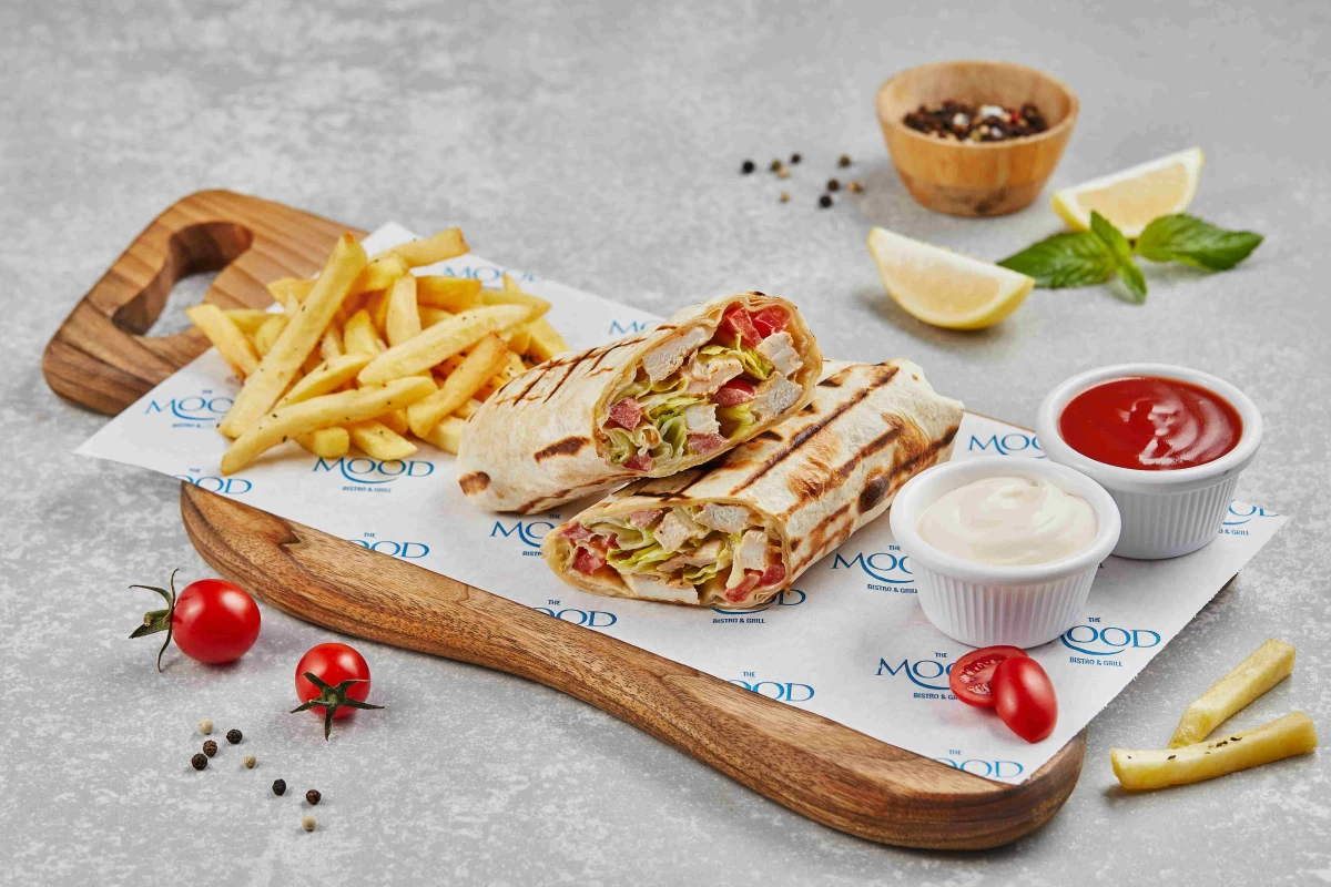 iceberg lettuce, chicken fillet, Caesar sauce, tomato, Parmesan, croutons, French fries, ketchup, mayonnaise